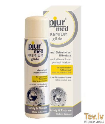Lubrikants Pjur Med Premium Glide uz silikona bāzes. Lubrikants mitrina ādu, padarot to samtainu un slidenu (āda nekļūst taukaina). Līdzekļa sastāvs piermērots jutīgai ādai (dermatoloģiski pārbaudīts). Piemērots lietošanai ar lateksa prezervatīviem. Sastāvā neietiplst taukvielas un eļļas. Izgatavots Vācijā.